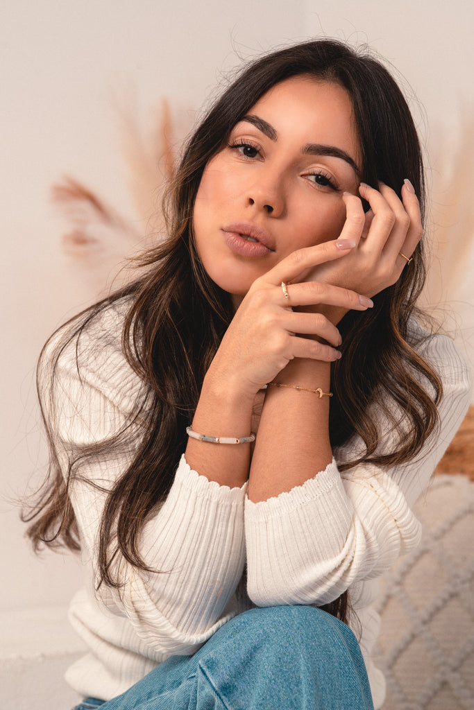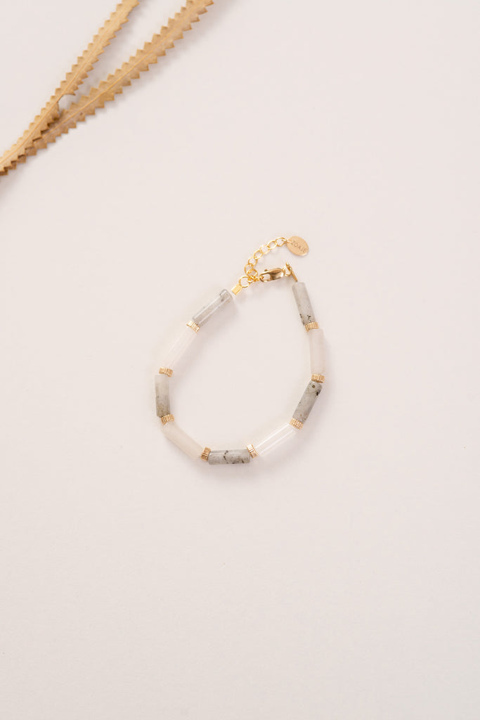 Our MONGOLIA bracelet is a striking piece designed with bold Labradorite and white Jade gemstones. These stones alternate along the bracelet, separated by beautifully textured Gold-filled beads. This design exudes elegance and timelessness, making a bold statement with its harmonious blend of textures and gemstones, reflecting the enduring beauty of Mongolia's cultural heritage.