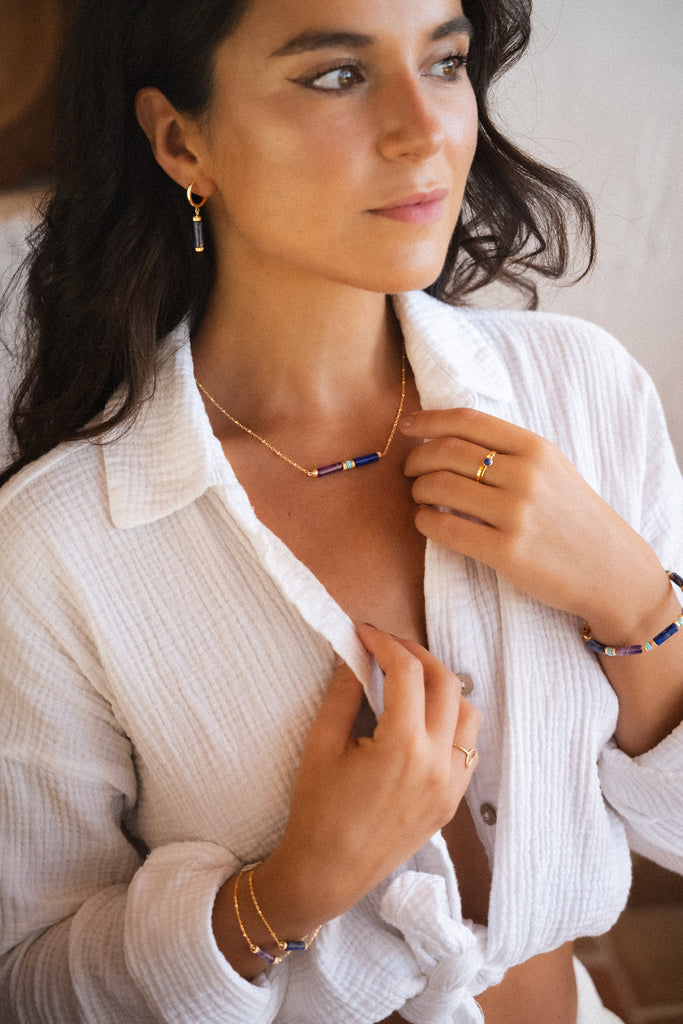 Natural lapis lazuli hangs from a golden hoop, like twilight at the edge of the shore — capturing the flow of light and the stillness of time, where reason and poetry intertwine.